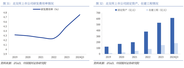 成长潜力方面,北交所上市公司24Q3研发费用率为4.75%,近年来持续增加。随着北交所上市公司的IPO募投项目陆续开工和建成投产,北证A股的在建工程、固定资产总额呈现持续增加态势,24Q3分别为185.93亿元和615.28亿元。