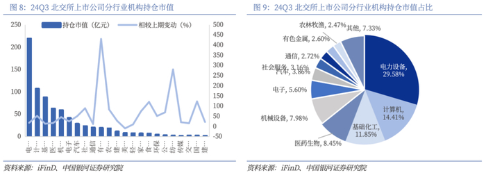 机构持仓聚焦电力设备等重点行业,有色金属行业机构持仓增速显著。从行业分布看,24Q3北交所上市公司机构持仓中电力设备(219.23亿元,占比29.58%)、计算机(106.80亿元,占比14.41%)、基础化工(87.86亿元,占比11.85%)行业持仓市值位居前列。其中有色金属(+429.29%)、纺织服饰(+279.74%)、国防军工(+122.17%)行业持仓市值相较上期增速较快。