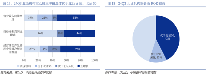 机构重仓股的三季报业绩总体优于北证A股、北证50指数。2024年前三季度,机构重仓的80家公司中,43家(占比为54%)公司实现营业收入同比正增长,65家(占比为81%)公司的营业收入同比增速优于北证50指数;35家(占比为44%)公司实现归母净利润同比正增长,43家(占比为54%)公司的归母净利润同比增速优于北证50指数;39家(占比为49%)公司实现经营活动产生的现金流量净额同比正增长,62家(占比为78%)公司的经营活动产生的现金流量净额同比增速优于北证50指数;34家(占比为43%)公司的ROE指标优于北证50指数(6.12%),44家(占比为55%)公司的ROE指标优于北证A股(5.02%)。在2024年前三季度北交所上市公司业绩普遍承压的背景下,机构重仓股的三季报业绩总体优于北证A股、北证50指数。