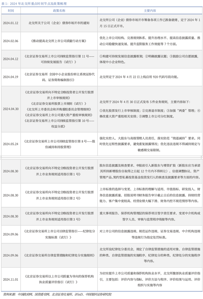 除此之外,2024年下半年,北交所政策更集中于监管细则和指引,8月30日发布的3条指引分别从法律类、财务类、程序类问题对北交所公开发行作出规范,以提高发行上市审核透明度;9月份,北交所继续发布了两条自律监管指引。