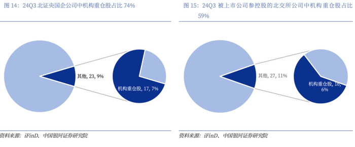 机构重仓偏好央国企、被上市公司参控股的北交所公司。截至2024年三季度,北证A股253家公司中,企业性质为“央企国资控股”、“省属国资控股”、“地市国资控股”的公司共计23家,其中17家公司为24Q3机构重仓股,占比为74%;此外,北证A股中共有27家公司被上市公司参控股,其中16家公司为24Q3机构重仓股,占比为59%。