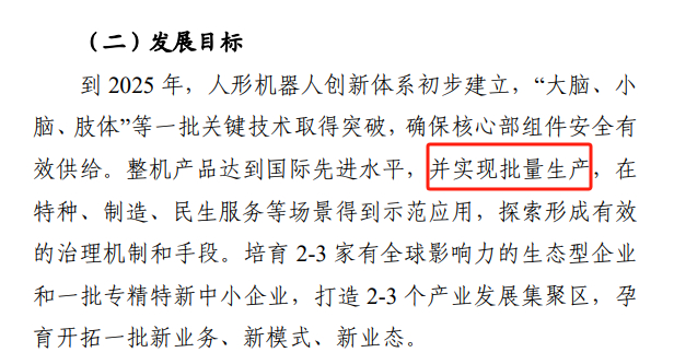 工信部发布的文件就明确提出,到2025年人形机器人实现批量生产;另外,在车端与机器人端零部件共通性较高的前提下,叠加大厂入局+技术迭代+政策催化的加持,这一目标有望成真。