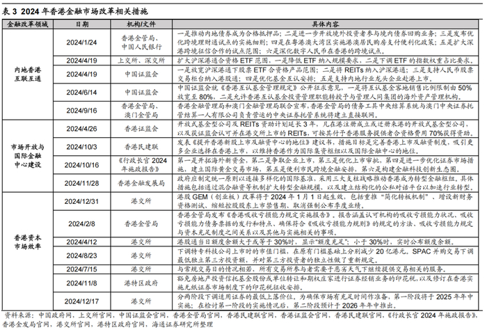 变量五:香港金融市场改革若持续推进,投资环境有望优化。面对全球资本市场的多元化、数字化及绿色转型趋势,24年中国香港加快金融市场改革,展望25年这一趋势有望延续,从而增强投资者信心,对港股走势形成长期正向支持。具体来看,参考24年改革重点,未来香港制度改革或聚焦以下三大方向: