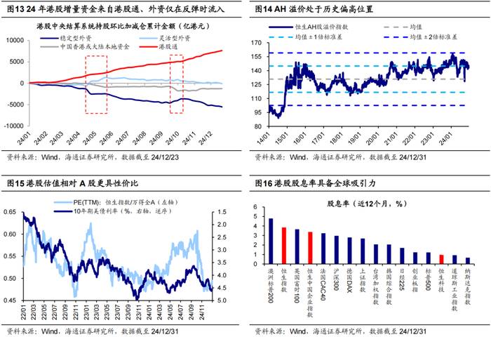 外资持续性回流还存在不确定性。24年外资整体净流出港股,主要因为稳定型外资持续流出,24年累计流出5544亿港元;而交易型外资在市场两波反弹时阶段性流入,24年累计流出102亿港元。展望25年,随着国内政策发力,基本面复苏的大趋势较为明确,外资有望阶段性回流、捕捉交易性机会,持续性回流仍有待观察。此外,从全球资配角度看,外资配置港股红利+科技板块的性价比边际提升。其一,当前港股股息率在全球排名前列,降息背景下港股高分红吸引力增强;其二,港股科技目前属于估值洼地,技术发展与监管趋弱背景下盈利预期逐步改善,外资或回流增配港股科技板块。