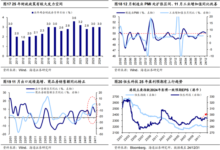 变量三:国内经济复苏进程如何?9/24以来国内政策基调已经明显转向,根据12月政治局会议和中央经济工作会议精神,25年宏观政策将“更加积极有为”,货币+财政政策基调为历次最积极,还明确“稳住楼市股市”,后续政策发力空间已经打开。当前政策效果已反映在部分宏观基本面数据上,若未来增量政策能较快落地见效至基本面,则有望对25年港股走势形成支撑。