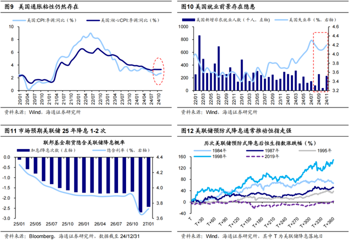 当前美国经济指标间存在矛盾,使美联储降息节奏更具变数。判断美联储货币政策的走向,最终需回归经济指标的表现,目前美国通胀与就业数据间存在矛盾。从通胀看,11月美国CPI同比为2.7%,连续两月回升,核心CPI同比为3.3%,连续四个月未下降,显示通胀粘性强;从就业看,11月美国失业率为4.2%,较10月回升,新增非农就业数据波动大,其中8、10月仅新增7.8、3.6万人,就业前景仍存隐患。在通胀有韧性、就业不明朗的背景下,鲍威尔在12月FOMC会议上表示,美联储今后考虑调整政策利率时应该会“更加谨慎”,我们认为这暗示降息步伐或放慢。考虑到特朗普政策的通胀属性,未来降息或受制于通胀与就业数据的博弈,降息节奏或有较多变数。截至24/12/31,彭博联邦基金期货隐含利率显示,市场预计25年美联储降息1-2次。总体来看,25年海外流动性环境偏松,参考过往,预防式降息后的宽松环境通常推动恒生指数走强。