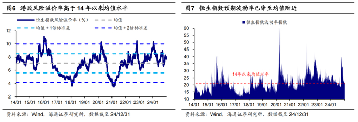 从风偏看,港股风险溢价较高、预期波动率下降。资产比价角度看,股市情绪处于历史偏低水平。当前港股风险溢价率(1/恒生指数PE-10Y中国/美国国债收益率均值)为7.77%、处14年以来从高到低35%分位,高于14年以来均值水平。预期波动率角度看,截至24/12/31,恒指波动率指数(衡量港股市场30个交易日的预期波幅)降至22.4,已降至14年以来均值附近,可见投资者预期有所改善。