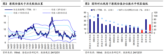 从估值看,全球对比视角下港股估值整体偏低。首先,港股估值处在历史较低位置。当前(截至24/12/31,下同)恒生指数PE(TTM,下同)已降至14年以来均值以下水平(3年滚动),为9.2倍、处14年以来26%分位。其次,国际对比视角下港股估值也偏低,当前恒生指数近十年PE分位数为21%、恒生科技为9%,低于标普500的94%、纳斯达克的92%,亦低于英国富时100的72%、印度Nifty50的68%、日经225的36%、法国CAC40的35%,港股估值分位数显著偏低,尤其是恒科指数。