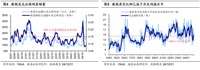 从情绪看,当前港股成交缩量、卖空比例偏高。一方面,港股成交额处于历史偏低位置且相较A股明显缩量。国庆节后港股成交萎缩,恒指成交额从10/8的6204亿元回落至12/31的745亿元,值得注意的是,相较于A股,本轮港股的成交缩量幅度更加显著。另一方面,港股卖空占比相较历史处于偏高位置。截至24/12/31,港股卖空成交额占市场总成交额的比例升至14.7%,高于14年以来的平均水平14.5%。