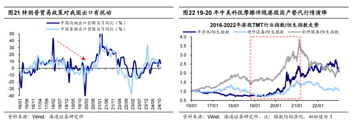 若特朗普贸易领域政策快速兑现,或对25年港股基本面及情绪面产生扰动。展望未来,若特朗普25年正式上台后加速对华贸易摩擦与科技制裁,则可能从基本面及情绪面影响港股走势。从基本面看,特朗普主张对外加征关税,这一政策若加码,或阶段性冲击我国出口。回顾其首任期,美国曾对中国四次发布加征关税清单,受美国加征关税影响的中国出口商品比例超过60%,同期我国出口数据明显降温,中国内地/中国香港出口当月同比从18年初的10.7%/18.1%下滑至19年末的8.1%/3.3%。从情绪面看,特朗普对华科技制裁可能压制港股风险偏好。其上一任期持续打压我国龙头科技企业,港股风险偏好受到压制,恒生指数风险溢价率从18/01的3.6%升至20/03的10.3%。此外,结构性投资机会值得关注,贸易争端可能催生国产替代行情,19-20年间港股半导体/硬件设备/软件服务指数曾分别跑赢恒生指数180/96/80个百分点。