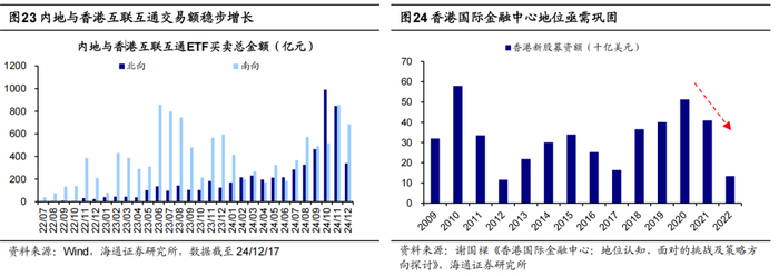 一是深化内地与香港互联互通。24年已推出放宽沪深港通下股票ETF合资格产品范围、放宽互认基金销售比例等措施。自22年7月ETF纳入互联互通标的以来,交易规模持续增长,24年11月北向/南向互联互通ETF买卖总额已分别达847/856亿元。此外,REITs纳入沪深港通、支持人民币股票交易柜台纳入港股通等措施有望逐步推出。