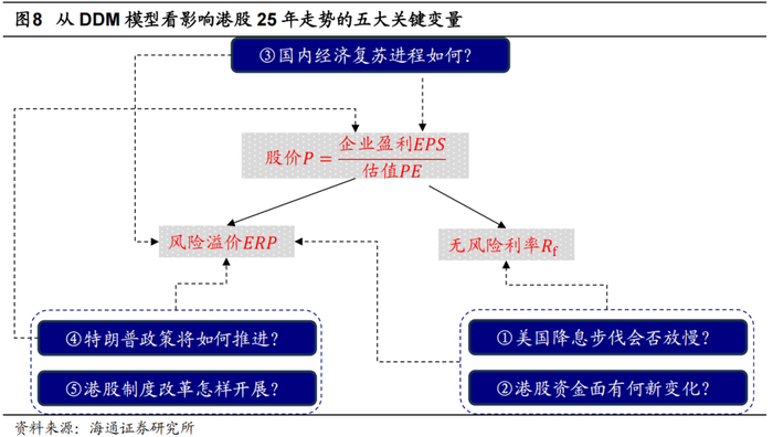 目前,港股已回调至高性价比区间,但未来能否实现上行,仍取决于诸多不确定因素的影响。相比A股,港股不仅对海外环境变化更为敏感,同时受中国内地、中国香港政治经济层面变化的影响。展望25年,我们认为,从DDM模型出发,海内外有五大关键变量或将决定港股的整体走势,第2-6部分将详细展开分析。
