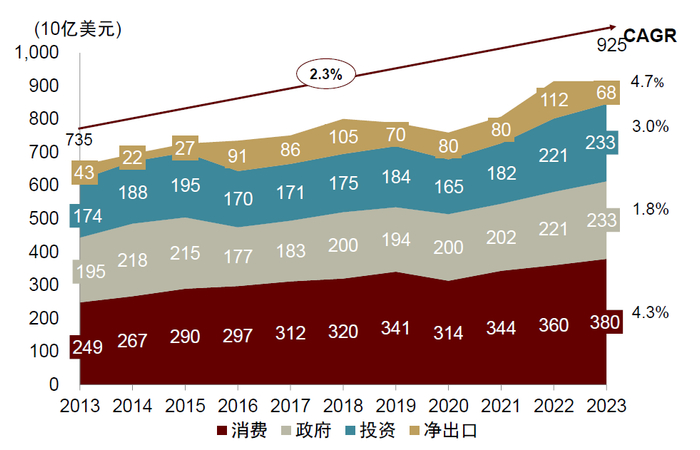 从2000年以来的需求法GDP各分项来看,消费、政府支出、投资、净出口,在2023年沙特实际GDP中占比分别为42%、26%、25%和7%。消费体现原油财富效应和民生政策支持,政府支出乘数效应显著,净出口2015-2023年复合增速12.4%。投资是近三年增速最高的分项,2020-2023年复合增速12.2%,高于2013-2023年间的10年复合增速3%。