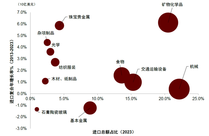 机械、化工、汽车是沙特三大主要进口商品品类,也是2021年以来增速最高的进口商品品类。2023年沙特最主要的进口商品包括机械、矿物化学品、交通运输设备、食品、基本金属,以上各类商品在进口总额中占比分别为21%、20%、17.5%、13.1%和8.5%。其中,珠宝、矿物化工、光学仪器进口十年复合增速最高。