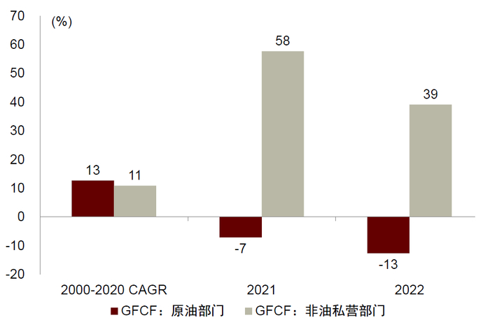 非油私营部门成为本轮周期中固定资本形成总额增长的主要动力,有助于沙特经济增长逐步换挡至投资驱动型,这是我们持续看好沙特的一个核心逻辑。本轮固定资本形成总额增长有别于以往各经济周期,主要是受益于沙特的工业化政策。近年来非油部门固定资本形成总额增速远超原油部门。2000-2020年期间,原油部门固定资本形成总额复合增速13%,同期非油私营部门固定资本形成总额复合增速11%,原油部门增速快于非油私营部门。2021、2022年受益于沙特经济转型政策对非油经济部门投资的支持,沙特非油私营部门投资增速分别达58%、39%(全球均值分别为6.1%和2.7%),同期原油部门则是负增长,非油私营部门固定资本形成高增长部分抵消原油部门减产对经济增长带来的负面影响。我们认为,2021年以来沙特固定资本形成总额的增长趋势,将推动沙特实际经济增长逐步换挡至投资驱动型。