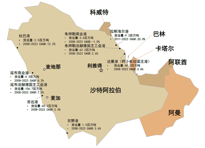 图表1:沙特阿拉伯地理位置及主要港口分布