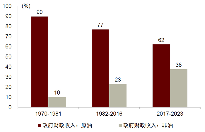 原油部门在沙特名义GDP中占比32%。从历史经验看,原油价格上行周期,原油部门在沙特名义GDP占比更高;在原油价格下行周期,原油部门在名义GDP中占比则较低,这一现象反映了沙特经济结构依赖原油部门的特点。1970年代原油部门约占沙特名义GDP的60%,在1981-86年油价下行周期这一比例降至32%左右,此后2000年代原油价格上行周期,原油部门在沙特GDP中占比一度回升至55%。