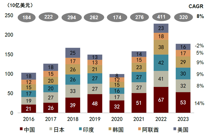 沙特的主要出口目的地分别为中国、日本、印度、韩国、阿联酋、美国。2023年,以上国家在沙特出口中占比分别为16.6%、10.2%、9.4%、8.9%、5.2%、4.9%。2016-2023年,沙特对中国出口复合增速14%,远超其他主要贸易伙伴国。