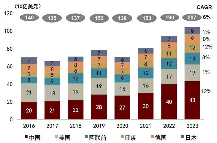 沙特的主要进口来源国分别为中国、美国、阿联酋、印度、德国、日本。2023年以上国家在沙特进口总额中占比分别为20.9%、9.1%、6.4%、5.6%、4.4%、4.0%。2016-2023年间沙特从中国和印度进口总额复合增速均为12%,领先于从其他贸易伙伴国进口增速。