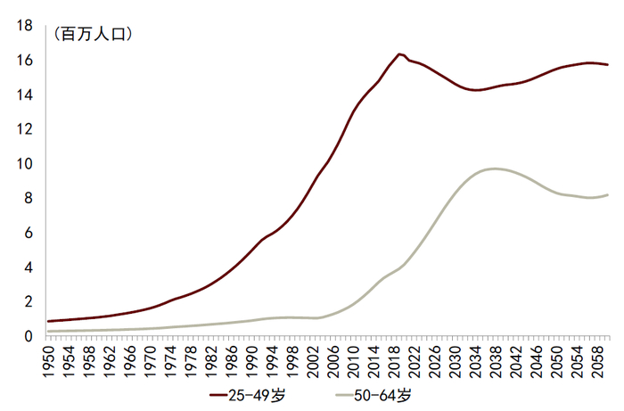 图表8:沙特25-49岁和50-64岁年龄组人口增长趋势
