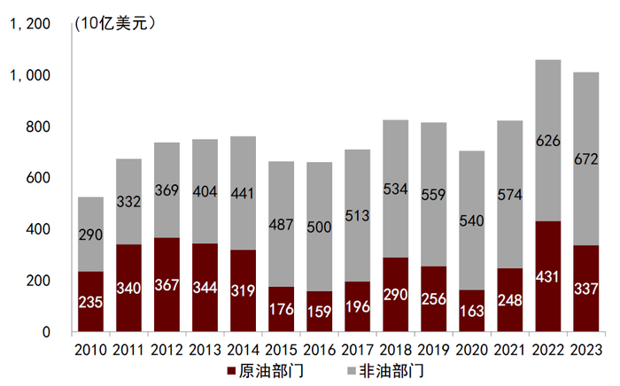 非油部门在实际GDP中占比50%,提前实现“2030愿景”经济转型计划中非油经济在实际GDP中占比达50%的政策目标。2023年受OPEC+自愿减产政策的影响,沙特作为减产政策的主要贡献国,原油部门实际GDP同比收缩9%。当年非油部门实际GDP增长4.4%,部分弥补原油部门下滑对经济的影响。