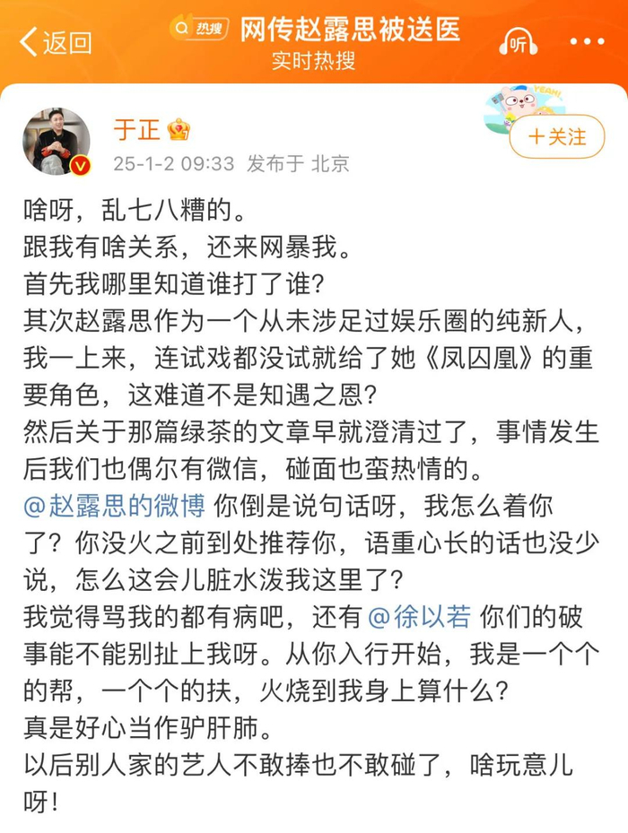 据于正个人社交媒体账号:啥呀,乱七八糟的。跟我有啥关系,还来网暴我。首先我哪里知道谁打了谁?其次赵露思作为一个从未涉足过娱乐圈的纯新人,我一上来,连试戏都没试就给了她《凤囚凰》的重要角色,这难道不是知遇之恩?@赵露思的微博 你倒是说句话呀,我怎么着你了?你没火之前到处推荐你,语重心长的话也没少说,怎么这会儿脏水泼我这里了?