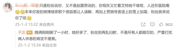 据了解,昨日下午,于正在社交平台上再发文称:“好了,别再叽叽喳喳了,让病人好好养病吧,我们俩关系挺好的,刚刚还聊了一小时,我给她的鼓励她也看到了,要我帮忙的我也帮了,别乱咬,给她遭黑,OK?当然,开心是最重要的,这事儿翻篇了。”