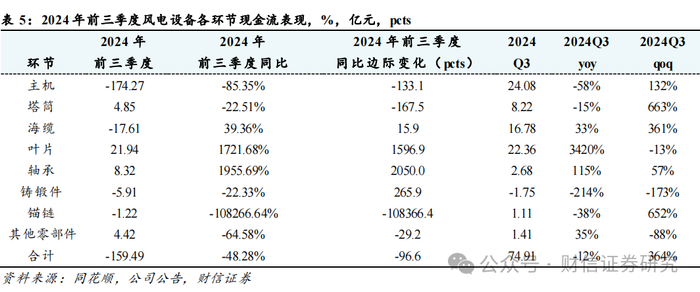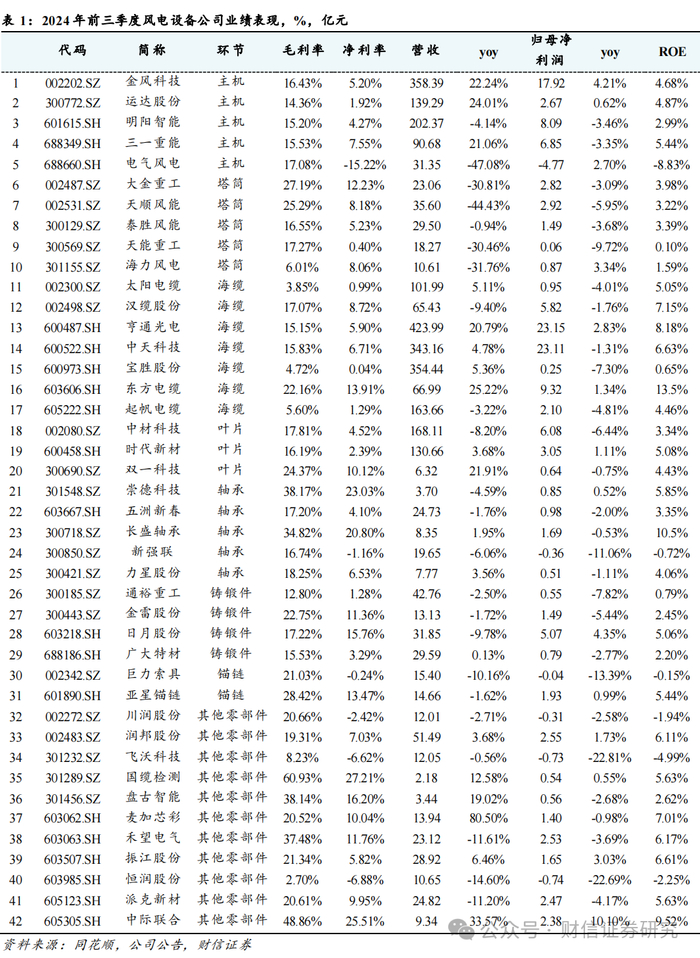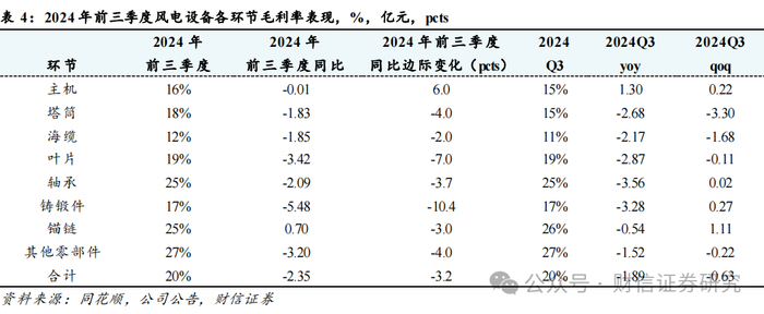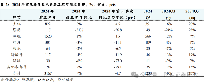 营收端:小幅增长。2024前三季度风电设备行业合计营收3167.42亿,同比+3.92%,其中Q3合计营收1229.50亿,同比+9.61%,环比+9.59%。整体看前三季度营收小幅增长,Q3营收同环比增长较多。分环节来:仅有主机、海缆、其他零部件前三季度营收保持同比增长,但是原因不一。主机主要是出口和陆风交付,海缆主要是中天科技和亨通光电的通信电缆,以及部分企业的陆缆增长,其他零部件的增长主要是来自非风电行业,比如汽车轴承、工程机械铸锻件等。