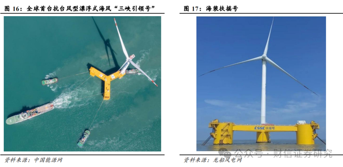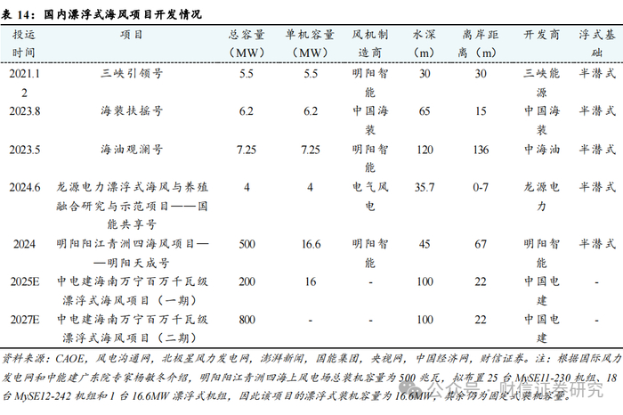 适用于深远海风开发的漂浮式海风示范项目已经逐步推进。此前我国已经有3个漂浮式海风示范项目陆续投运:2021年12月,“三峡引领号”实现商业化并网发电,单机容量为5.5兆瓦。这是我国首台半潜漂浮式海上风力发电系统装备,也是全球首台抗台风型漂浮式海上风电机组,装备自主化率超过95%。2023年5月,单机容量为7.25兆瓦的中海油“海油观澜号”漂浮式海上风电机组在距离海南文昌136千米的海上油田海域投运,成为全球第一个离岸距离超过100千米和海水深度超过100米的“双百”海上风电项目。2023年8月,单机容量为6.2兆瓦的中船海装“扶摇号”漂浮式海上风电装备在智能微网模式下成功运行发电。我们预计到2024年底,国内漂浮式海风投运项目有望增至5个,装机规模合计达到39.55MW,浮体基础的技术方案集中采用半潜式;其中2024年新增的主要是龙源电力和明阳智能的两个项目合计20.6MW。在建项目主要是中电建的海南万宁百万千瓦漂浮式海上风电项目,也是全球最大规模的商业化漂浮式海风项目,项目位于海南省万宁东部海域,场址平均水深100米,离岸距离为22公里,规划面积160平方公里。项目规划总装机容量100万kw,分两期进行开发。一期建设规模为12台单机容量16MW以上的风机,装机规模20万kw,预计2025年底建成投产;二期建设规模80万kw,计划2027年底建成投产,标志着我国漂浮式海风由单台样机试验阶段开始转向规模化开发阶段。