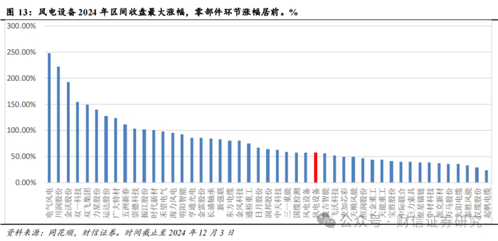 相比于主产业链环节,零部件厂商在股价表现上更加亮眼。我们统计了风电设备厂商在2024年内的区间收盘最大涨幅情况,可以看到以川润股份、金沃股份、双一科技和双飞集团等为代表的零部件厂商涨幅明显居前,不仅大幅跑赢风电设备指数,也明显强于大金重工、天能重工、天顺风能、东方电缆和金风科技等主产业链厂商。显著异常的是作为主机厂商的电气风电,但其主要是因为市场炒作上海微电子注入的可能。