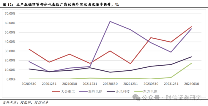 主产业链环节仍然聚焦“两海”。“两海”战略在过去几年已经成为风电行业的发展共识,尤其是其中的主机、塔筒和海缆等主产业链环节,虽然这几年国内海风连续不及预期,但是海外的营收占比整体呈上升趋势。