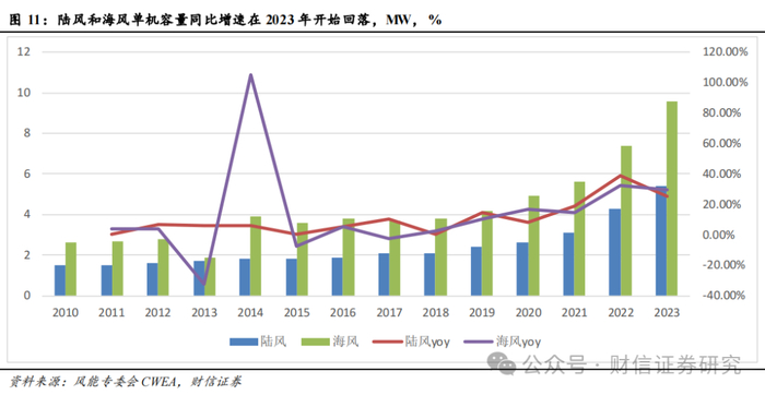 从设备厂商的角度来看,也不再一味追求大兆瓦的技术升级,或者说在当前的平均兆瓦级别上再去过分追求更大兆瓦已经没有性价比。陆风和海风的平均单机容量经过前几年的迅速提升后,再继续提升兆瓦级别带来的降本效益已经边际递减;而与此同时大兆瓦带来的技术风险、加工难度和产业链协同成本却在边际递增。从风能专委会CWEA发布的《2023年中国风电吊装容量统计简报》来看,虽然2023年风机大型化趋势仍然比较明显,但是单机容量的同比增速在2022年见顶,2023年增速开始回落。