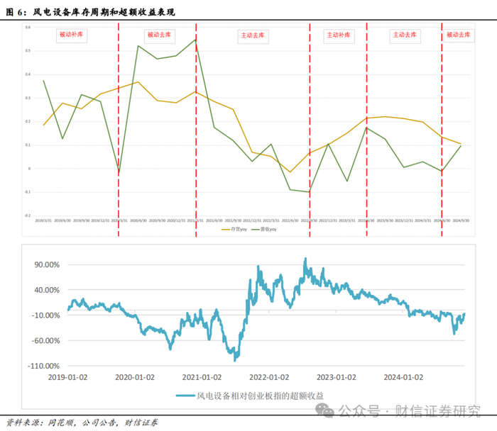 2025年风电设备行业有望从被动去库进入到主动补库。风电尤其是海风项目的周期本身较长,且2020—2021年抢装、2022年至今海风不断延期,扰乱了正常的库存周期表现。与典型的库存周期表现有所不同,2019年至今风电设备的营收和存货增速基本呈同步正相关变化趋势,我们认为主要是需求端的两点原因:1)2020—2021年抢装潮前后的需求爆发式增长和断崖式下滑;2)海风项目的周期较长,一旦项目滞后会导致整体交付周期拉长,从2022年至今表现尤为明显。以上两点原因扰乱了风电设备库存周期的正常表现,从最近的两年表现来看:a)2022年三季度到2023年半年报,存货和营收均同比提升,呈现出主动补库存的特征,我们认为主要是因为期间陆风新增装机较多,根据中电联2021—2024年的全国电力供需形势分析预测报告,2023年国内陆风新增装机65GW,同比+85.7%。b)但从2023年半年报到2024年半年报,存货和营收增速都开始逐步回落,又呈现出主动去库存的表现,我们认为主要是下游需求增速迅速回落(根据国家能源局数据:2023年前三季度陆风新增3205万kw,同比+78.1%;2024年前三季度陆风新增3665万kw,同比仅+14.4%,增速大幅回落),设备厂商主动放缓生产并着力消化现有库存,使得存货增速下降;同时,在库存消化过程中可能还伴随着降价促销等,导致营收增速也进一步下降。c)从2024年半年报开始,营收增速开始向上、存货增速继续向下,呈现出被动去库的特征。考虑到2024年前三季度的巨量招标有望在2025年大部分实现并网,因此我们倾向于认为后续营收端增速有望继续向上、存货增速在继续下行后有望拐头向上,整体来看风电设备行业的需求端有望在2025年明显改善,并带动行业实现从被动去库切换为主动补库。