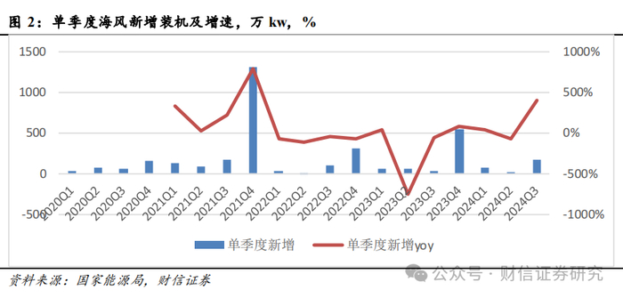 2024年前三季度海风同比+73%, Q3海风同比+397%。根据国家能源局数据,2024年前三季度,全国风电新增并网容量3912万千瓦,同比+16.8%,其中陆风3665 万千瓦,海风247万千瓦,分别同比+14.4%和+73%。Q3海、陆风新增装机分别为164万kw、1164万kw,分别同比+397%和+14.6%。整体来看,2024年前三季度风电整体和陆风的装机增速比较平稳;海风增速较高,一方面是去年前三季度的基数较低(2023年前三季度海风新增装机仅有143万kw,仅略高于2022年前三季度的124万kw),另一方面是2024Q3海风单季度新增装机164万kw,同比+397%,带动海风前三季度同比+73%。