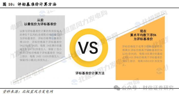 3)2024年11月,国家电投集团2024年第二批陆上风力发电机组规模化采购项目正式开标,项目总规模8.4GW,包括采购容量7.2GW以及储备容量1.2GW,单机容量要求5MW-10MW。其中7.2GW项目容量分为30个小标段对外进行招标采购。在本次招标采购中,国家电投集团对评标基准价计算方法进行了修改,不再以最低价为评标基准价,而是以有效投标人评标价格的算术平均数再下浮5%作为评标基准价。当企业报价低于或等于评标基准价时,得满分;当企业报价高于评标基准价5%以内(含5%)的,每高1%在满分的基础上扣0.4分;评标价格高于评标基准价5%以上部分,每高1%扣0.8分,直到扣完为止。这项规则的优化,使得最低报价不一定中标。