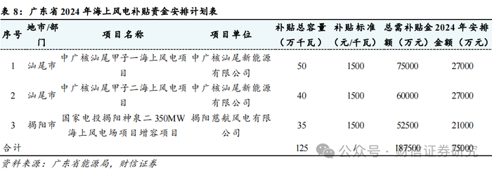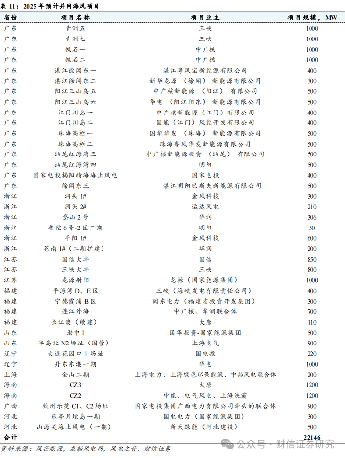 预计2025年国内海风新增并网有望达到15GW。结合沿海各省的2024年重点建设项目计划以及各个项目的建设进度,我们盘点下来有接近22GW的海风项目有望在2025年实现全容量或部分容量并网。其中广东作为传统的海风大省,一方面此前滞后的青洲五七和帆石一二有望在2025年并网,另一方面参考海风项目从竞配到投产大约两年的时间周期,我们也梳理了广东省2023年竞配的15个海风项目的进展情况,我们预计其中的徐闻东一、二等9个项目合计约4GW有望在2025年全容量或部分容量并网。因此合计算下来2025年广东省有接近9.4GW海风项目有望进入投产周期。