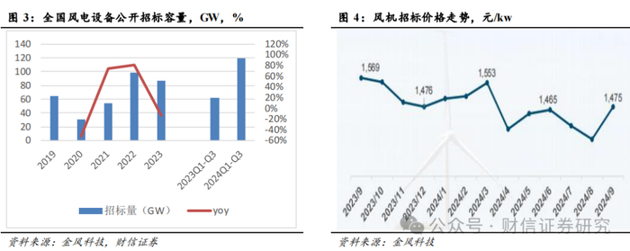2024年招标量创历史新高,尤其是陆风。根据金风科技2024年的三季度业绩演示材料:2024年1-9月,国内风电新增招标119.1GW,相较去年同期的61.7GW同比+93%。按市场分类,陆风111.5GW、海风7.6GW。考虑到今年招标风机项目大部分并网建设在2025年进行,预计2025年新增装机有望实现较大幅度增长。中标价格维持区间稳定。根据金风科技2024年三季度业绩演示材料,2024年前三季度风机投标均价维持在1450-1550元/kw水平,全年呈现出低价企稳趋势。此外,近期北京风能展多家整机企业签订行业自律公约,整机环节的“价格内卷”有望改善。