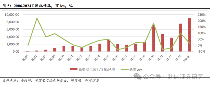 预计2024年新增风电装机90GW。根据央视网的报道,预期2024年中国海上风电装机容量有望突破4500万千瓦。再结合过去几年单Q4新增装机表现,以及2024年前三季度新增装机情况,我们预计2024年风电新增装机90GW,其中陆风和海风分别为82和8GW。与中电联披露的2023年陆风新增65GW、海风新增6.83GW相比,陆海风分别同比+26%和+17%。
