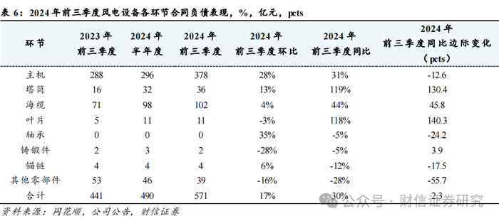合同负债:同环比大幅增长,验证下游需求高景气度。截至2024年9月底风电设备行业合同负债合计571亿,同比+30%,环比+17%,同环比均大幅增长。分环节来看:叶片、塔筒、主机和海缆等环节的合同负债规模高增,验证下游需求高景气,公司在手订单充沛。