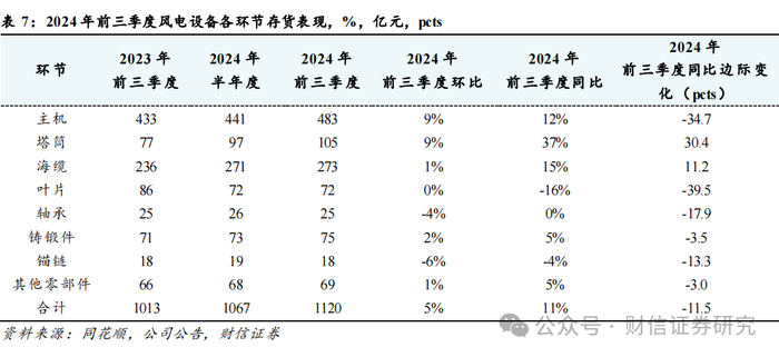存货:绝对值创历史新高,但增速进一步放缓。2024三季报风电设备行业存货合计1120亿,同比+11%,环比+5%,存货绝对值创行业历史新高,但增速相较于2023年同期的增速下降约11.5pcts。我们认为,随着进入2024Q4装机旺季,叠加部分重要海风项目的开工,预计行业库存增速有望进一步下降。分环节来看:制造环节中叶片、轴承和锚链存货同比有所下降,其余各环节存货规模同环比均有所增长,其中塔筒、海缆及整机环节的同比增长幅度较大,预计主要为四季度装机旺季以及2025年预生产准备。