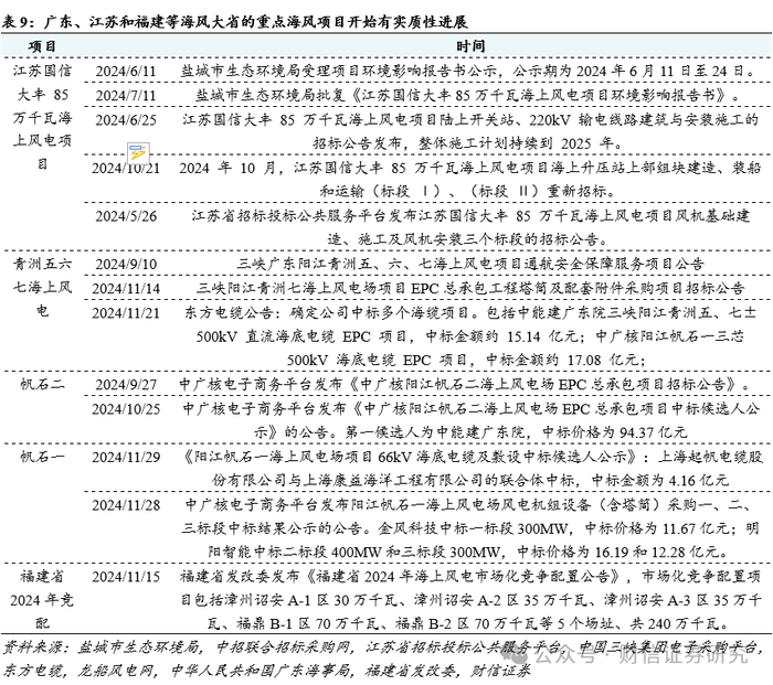 广东、江苏等海风大省的重点海风项目,此前项目进度严重滞后,但当下已陆续进入施工周期。客观来说,从2020年陆风抢装、2021年海风抢装后至今,风电尤其是海风的装机增速基本上是低于市场预期的,其中最主要的问题就是广东和江苏等海风大省的重点海风项目因为各种原因导致项目进度严重滞后。1)2021年底江苏省竞配的3个海风项目:射阳100万kw、国信大丰85万kw、三峡大丰80万kw合计2.65GW,竞配结果公示后市场预期2022年开工、2023年并网投产。但从当前时点来看,三大项目基本要到2025年才能并网投产,相当于滞后了两年时间。2)广东的青洲五六七合计3GW项目,根据《关于三峡阳江青洲五100万千瓦、青洲六100万千瓦、青洲七100万千瓦海上风电项目投资决策的议案》,青洲五、七项目计划2024年12月全容量并网;青洲六项目计划2024年6月全容量并网。但从目前的项目实际进展情况来看,预计青洲五、七项目在2024年底开工、2025年底并网,青洲六目前正在抓紧施工,预计2024年底或2025年初并网。3)广东的帆石一二合计2GW项目,根据《中广核阳江帆石二海上风电场 epc 总承包项目招标公告》,帆石二计划2024年11月30日开工,2025年12月 30日前完成全部并网发电,帆石一虽然目前尚未有明确的完工时间,但考虑到帆石一、二项目的协同性以及整体项目推进情况,预计帆石一也有望在2025年左右完工。