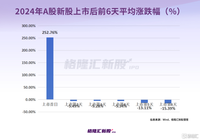 2024年在A股上市的100家新股中,上市首日平均涨幅约253%,但从上市第2天至第6天大部分企业的股价会持续阴跌,且平均跌幅呈扩大趋势。