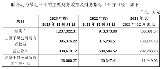 受益于行业高速发展,联合动力近年来保持较快的发展趋势,2021年度至2023年度,联合动力的营业收入分别为29.23亿元、50.05亿元和93.87亿元,营收复合增长率达到 79.21%;2021年和2022年的归母净利润分别亏损1.19亿元和2.03亿元,在2023年,其归母净利润首度扭亏,达到了2.61亿元。