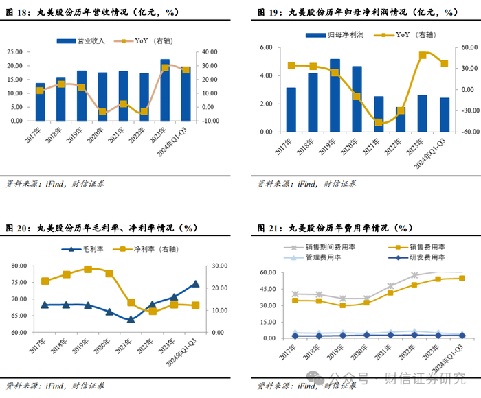作为“重组胶原蛋白护肤”的领军企业,丸美股份持续推进研发全链路全域布局。公司成立于2002年,主要以皮肤科学和生物科学研究为基础,从事各类化妆品的研发、设计、生产、销售及服务。公司作为“重组胶原蛋白护肤”的领军企业,自2021年,公司连续三年举办 “重组胶原蛋白科学家论坛”,并在第三届论坛上联合五国院士专家共同发布《重组胶原蛋白国际院士专家共识》,为重组胶原蛋白成分提出了高质量标准。2023年,公司主导牵头的《重组可溶性胶原》行业标准正式通过国家工信部立项,促进了重组胶原蛋白行业的有序发展。同年,公司获得了广东省“专精特新”企业的称号。2018-2023年,公司营收由15.76亿元提升至22.26亿元,2018-2023年复合增长率高达8.66%。2024年前三季度,公司实现营收19.52亿元,同比增长27.07%;归母净利润2.39亿元,同比增长37.38%;扣非归母净利润2.26,同比增长44.09%。