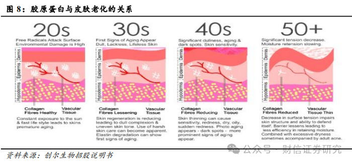 一方面,胶原蛋白会随着年龄增长而流失,有效补充胶原蛋白有利于皮肤保持年轻化和健康。据创尔生物招股说明书显示,20岁后皮肤厚度每10年胶原蛋白降低7%,女性绝经后5年胶原蛋白流失30%,之后每年流失1.13%。而这种胶原蛋白的自然流失会导致皮肤失去弹性,甚至出现松弛、皱纹等老化迹象。因此为延缓衰老,补充胶原蛋白显得尤为重要。而胶原蛋白合理补充不仅有助于恢复皮肤的紧致与弹性,还能在一定程度上减缓皱纹的形成,为肌肤注入新的活力与光泽,是维持皮肤健康与年轻态的关键途径。