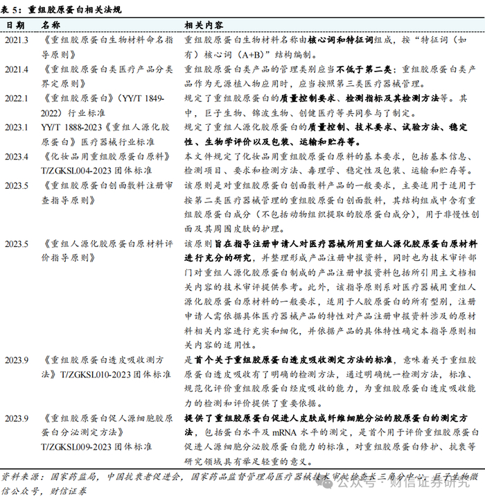 更规范、更标准的市场生态正在逐步建立。由于缺乏统一的规范和标准,作为全新生物材料的重组胶原蛋白在发展初期经历了一段无序增长的阶段,更限制了重组胶原在复杂场景中应用的可能。因此为了引导行业健康有序发展,自2021年起,国家药监局相继颁布了多项重要指导性文件,例如发布了《重组胶原蛋白生物材料命名指导原则》《重组胶原蛋白类医疗产品分类界定原则》,首次对重组胶原蛋白生物的分类和命名进行了明确规范,并将其科学划分为重组人胶原蛋白、重组人源化胶原蛋白和重组类胶原蛋白三大类别,为重组胶原蛋白的高质量发展奠定了基础。2022年1月,国家药监局进一步发布了《重组胶原蛋白》行业标准,并于同年8月正式实施,标志着国家对重组胶原蛋白医药应用首次出台了规范化文件。2023年6月,《化妆品用重组胶原蛋白原料》团体标准正式颁布并实施,不仅填补了中国化妆品用重组胶原蛋白原料领域的标准空白,更全面地保障用户获得美妆正品的消费体验,助推化妆品行业规范发展。2023年9月,由巨子生物牵头制定,西北大学、中国科学院过程工程研究所等共同起草的《重组胶原蛋白促人源细胞胶原蛋白分泌测定方法》《重组胶原蛋白透皮吸收测定方法》两项团体标准正式发布。其中,作为首个用于评价重组胶原蛋白促进人源细胞分泌胶原蛋白能力的标准,《重组胶原蛋白促人源细胞胶原蛋白分泌测定方法》对重组胶原蛋白在修护、抗衰等领域的研究具有举足轻重的意义。