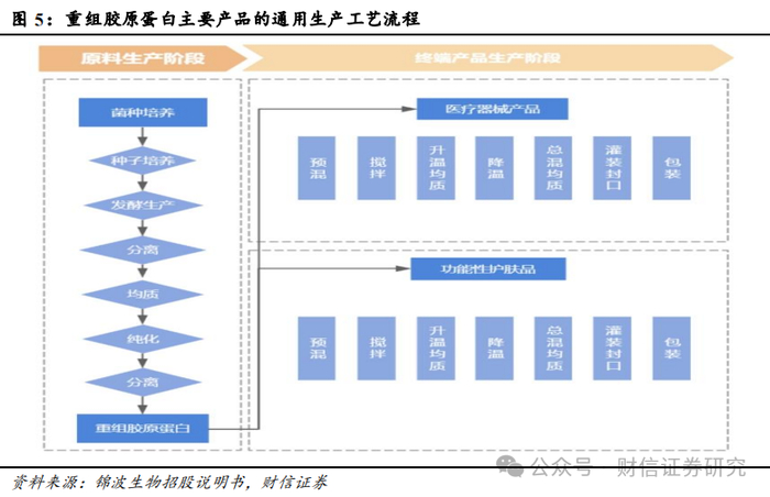 另外,根据来源和制备方式不同,胶原蛋白一般分为动物组织提取的动物源胶原蛋白和生物合成的重组胶原蛋白。其中,1)动物源胶原蛋:又被称为天然胶原蛋白,一般通过酸碱水解法、酶解法、热水浸提法等方法从牛皮、猪皮、鱼皮等胶原含量高的动物组织中进行提取。其提取工艺较为成熟、生产成本较低、生产过程相对简单,且三螺旋结构保留完整,但存在动物源疾病感染、免疫排斥或过敏反应等风险。2)重组胶原蛋白:则是采用重组DNA技术,对编码所需人胶原蛋白质的基因进行遗传操作和修饰,利用质粒或病毒载体将目的基因带入适当的宿主细胞(细胞、酵母或其他真核细胞等)中,表达翻译成胶原蛋白或类似胶原蛋白的多肽,经过提取和纯化等步骤制备而成。