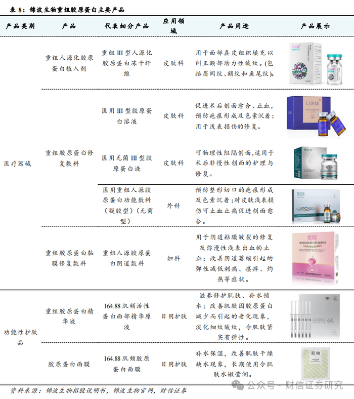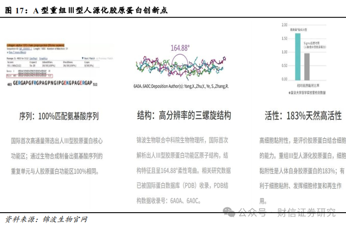 产研深度融合,铸就核心技术护城河。一方面,公司旗下产品-重组III型人源化胶原蛋白冻干纤维,是我国首个采用重组人源化胶原蛋白制备的三类医疗器械,具有显著的产品优势:1)安全性高,氨基酸序列重复单元与人体III型胶原蛋白核心功能区一致,不含非人胶原蛋白氨基酸序列,无免疫原性;2)精准的164.88°三螺旋结构与水溶性完美平衡,可以组装成胶原蛋白纤维网,构成人体细胞外基质(ECM)成分,对受损组织、细胞起到连接、支撑作用,并提供良好的细胞外基质环境,使受损组织得到修复、重塑;3)首次利用合成生物技术实现了具有高级结构的A型重组人源化胶原蛋白的规模化生产。另一方面,公司已自主形成了蛋白结构研究及功能区筛选技术、功能蛋白高效生物合成及转化技术、功能蛋白标准化注射剂研究平台、功能蛋白多维度评估BSL-2实验室及临床前应用平台五大核心技术平台,产学优势深度融合。此外,公司还先后与复旦大学、四川大学、重庆医科大学第二附属医院成立相关联合研究中心,持续研究病毒进入抑制原理、推进不同类型胶原蛋白的空间结构及功能位点的解析,储备更多具备不同特点的功能性蛋白。截至2024年6月末,公司已完成了包括I型、III型、 XVII型等重组人源化胶原蛋白的主要研究,并在皮肤科、骨科、外科、泌尿科、妇科、口腔科等领域持续开展应用研究。