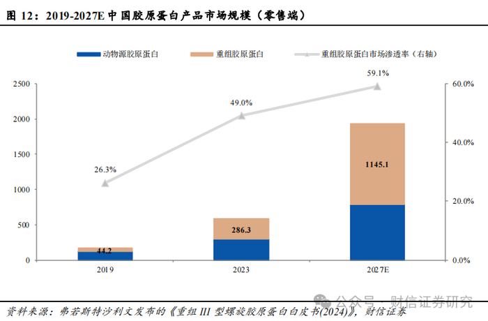 另一方面,由于不健康生活方式、长时间暴露于电子设备辐射环境,以及环境问题等因素,各种问题性肌肤状况频出。据巨子生物招股说明书显示,2021年,我国问题性肌肤人群总数已超过4亿人,占总人口的30%以上,急剧增长的问题性肌肤人群快速推动了功能性护肤品市场增长。其中,基于重组胶原蛋白的功效性护肤品表现更为亮眼,主要基于四点原因,一是重组胶原具有强劲的结合水能力,在为细胞活性创造良好的环境同时,还能为表层皮肤提供充足的结合水,保证皮肤含水量;二是胶原蛋白能激活细胞的代谢功能,可以通过酪氨酸残基竞争与酪氨酸酶的活性中心结合,减少多巴的生成,降低表层皮肤的色素沉淀,从而避免形成色斑;三是重组胶原稳定的三螺旋结构可以形成致密规整的超螺旋胶原纤维网,有效地修复原本的胶原蛋白断裂,并在表层皮肤之下形成结缔组织,修复受损屏障的同时,抑制表层细胞的衰老;四是以合成生物技术制备的小分子重组胶原蛋白,分子量更小,更易透皮吸收。据弗若斯特沙利文数据显示,2019年-2023年,基于重组胶原蛋白功效性护肤品的零售端市场从19.5亿元增长至115.4亿元,复合增长率为55.9%,预计到2027年将增长至664.6亿元,2024-2027年复合增长将达到54.9%。