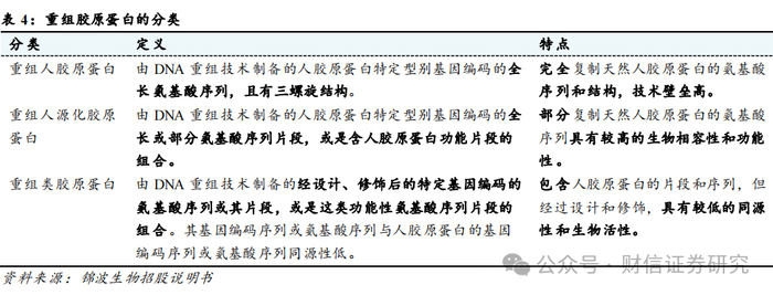 此外,根据2021年3月国家药监局发布的《重组胶原蛋白生物材料命名指导原则》,重组胶原蛋白又可以分为重组人胶原蛋白、重组人源化胶原蛋白和重组类胶原蛋白。其中,重组人胶原蛋白是重组胶原蛋白最高的一级,要求需同时具备“全长氨基酸序列”和“三螺旋结构”两大核心要素,生物活性最优。其次分别是重组人源化胶原蛋白、重组类胶原蛋白。